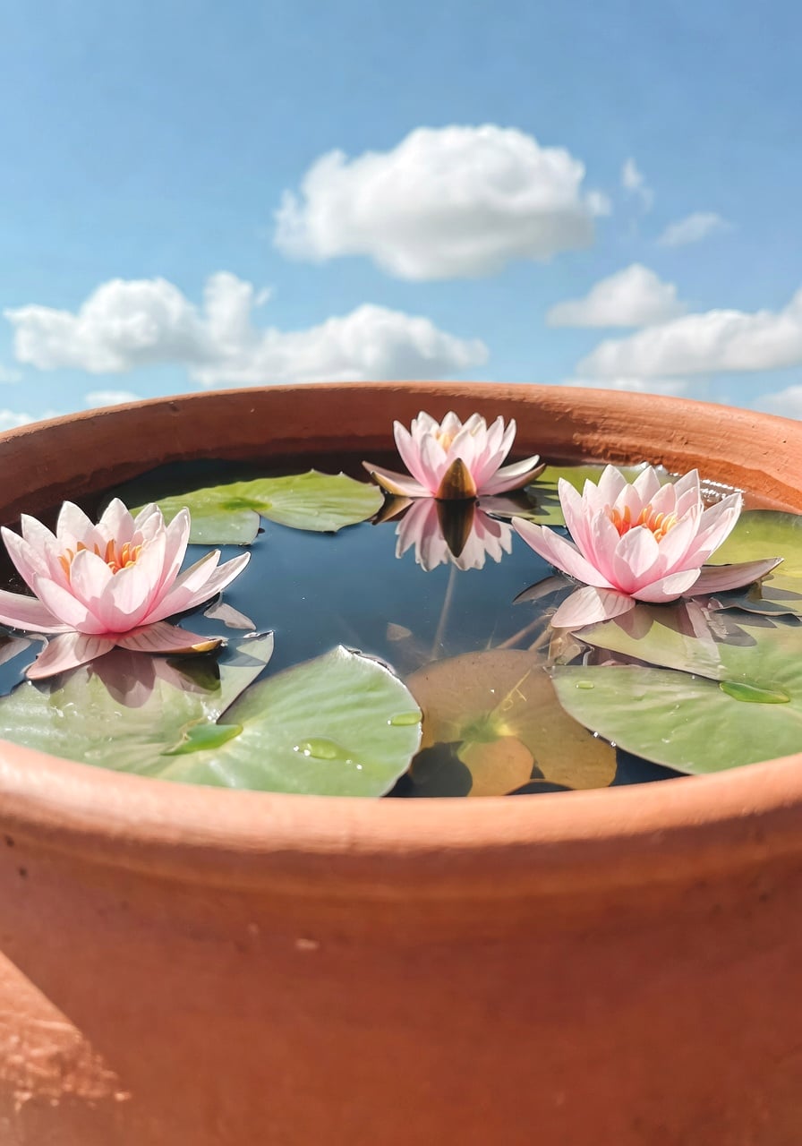 四季的變化會改變整個容器的個性。春天,新葉冒出,花朵嬌嫩;夏天,葉片鋪滿水面,花朵繁茂;秋天,某些品種的葉子轉色、花期延伸;冬天,水面寧靜,是休眠的季節(在溫暖地區,睡蓮可能持續開花)。