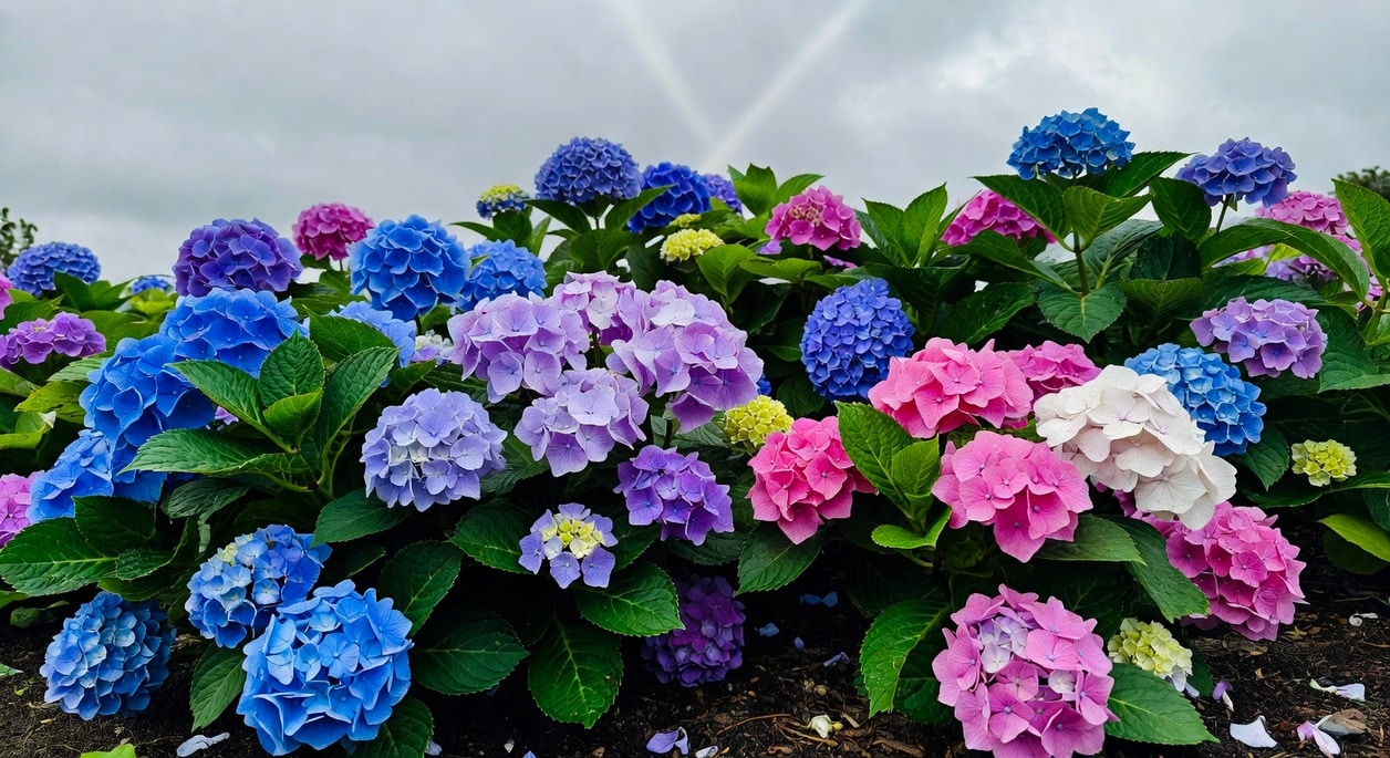 台灣大部分地區水質偏鹼,自然呈粉色。要出現深藍需要持續調理——不是一次施肥就能改變的。堅持每個月施一次硫酸鋁或明礬,同時用酸性介質(泥炭土、松針)改良土壤,通常一年後會有明顯改變。