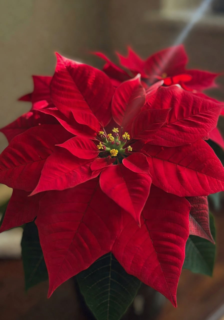 首先要破除一個最常見的誤會。我們看到的聖誕紅的紅色部分,其實不是花朵。真正的花是中間那一串微小的黃色東西,我們叫它「花序」。那些鮮紅、粉紅或白色的部分,其實是變異了的葉片,植物學上叫「苞葉」。聖誕紅用這個視覺魔法來吸引蜜蜂或蜂鳥,真聰明。所以當你看到網路上說「聖誕紅的花謝了」,實際上指的是那些紅色苞葉開始褪色或脫落。明白這一點以後,你就能更有策略地照顧它。