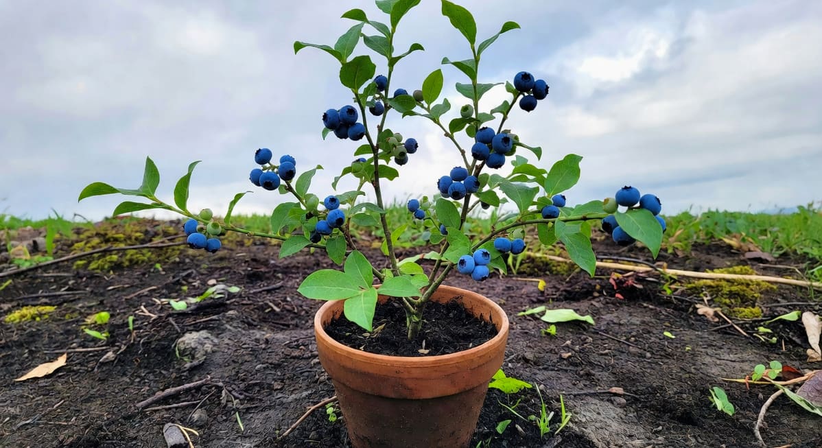 盆子的選擇也很關鍵。10 到 15 加侖的容器最剛好,既給根系足夠空間,又不會太大不好管理。一定要確保盆底有充分的排水孔,藍莓根系嬌嫩,悶根就完蛋了。