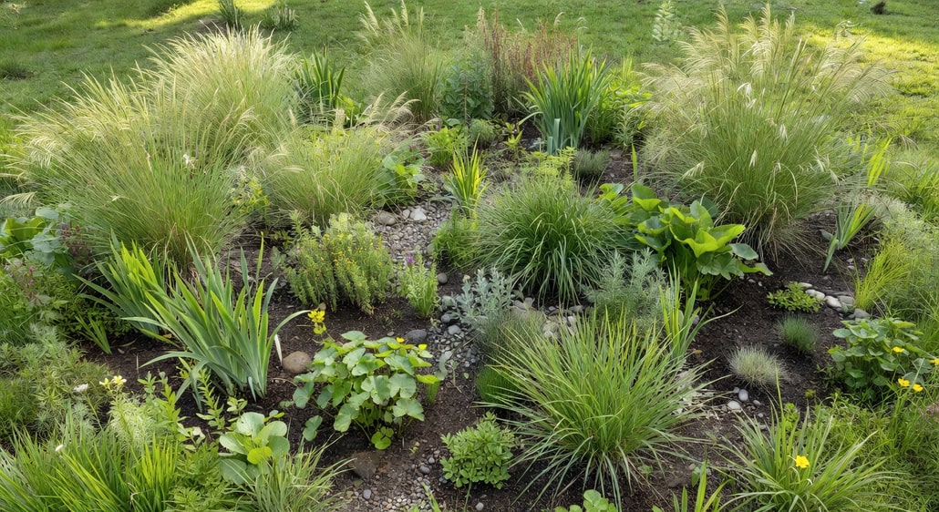 成功的雨水花園設計應該選擇多樣物種的組合,而非單調的單一植物。建議的搭配方式是:選擇3-5種上層樹木、5-8種中層灌木、8-12種下層多年生草本和蕨類。這樣的多樣性組合提供: