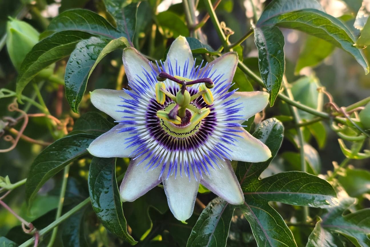 你見過許多花,精緻的、豔麗的、素淡的、芬芳的;但西番蓮的花是另一種類別——它的複雜程度超出了你對「一朵花」的既有認識。那外圍放射狀的萼片和花瓣,排列得如同一顆爆炸中的星體;而花芯部分,那一圈又一圈、藍白紫三色交替的絲狀流蘇(corona),以一種讓人懷疑這究竟是生物還是精工藝術品的方式排列著。中央的柱頭和雄蕊合生成一個結構性的整體,有著裁決性的對稱感,直立在那一切複雜的外圍之中,像是一個宣言的結點。