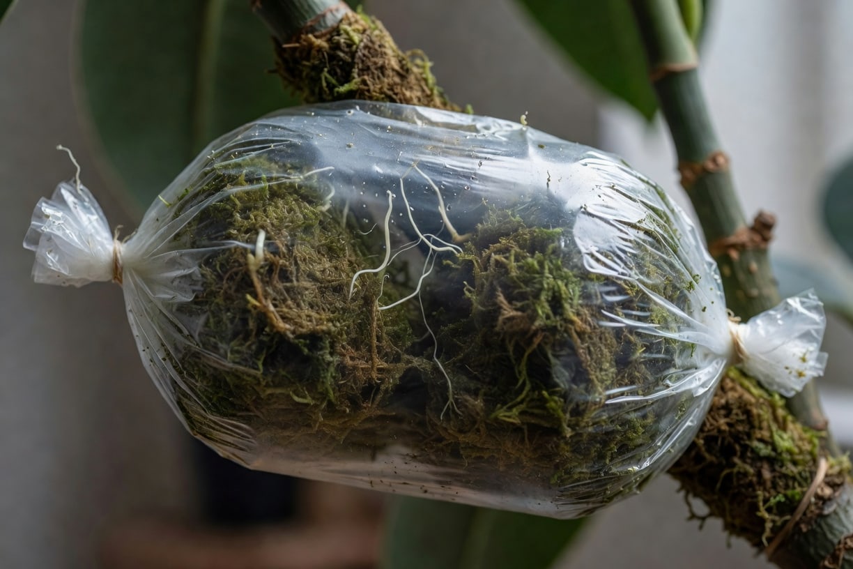 取一把濕潤水苔(體積約為鵝蛋大小)包覆剝皮區域,要確保水苔完整覆蓋傷口四周,並延伸到傷口上下各 3 至 5 公分。接著用透明塑膠袋或保鮮膜緊密包裹整個水苔球,兩端用嫁接膠帶(grafting tape)或黑色電氣膠帶緊密封閉,防止水分蒸發。使用透明材質包覆的優點是可以直接從外部觀察根系的發育情況,不需要拆開就能判斷是否已生根成功。
