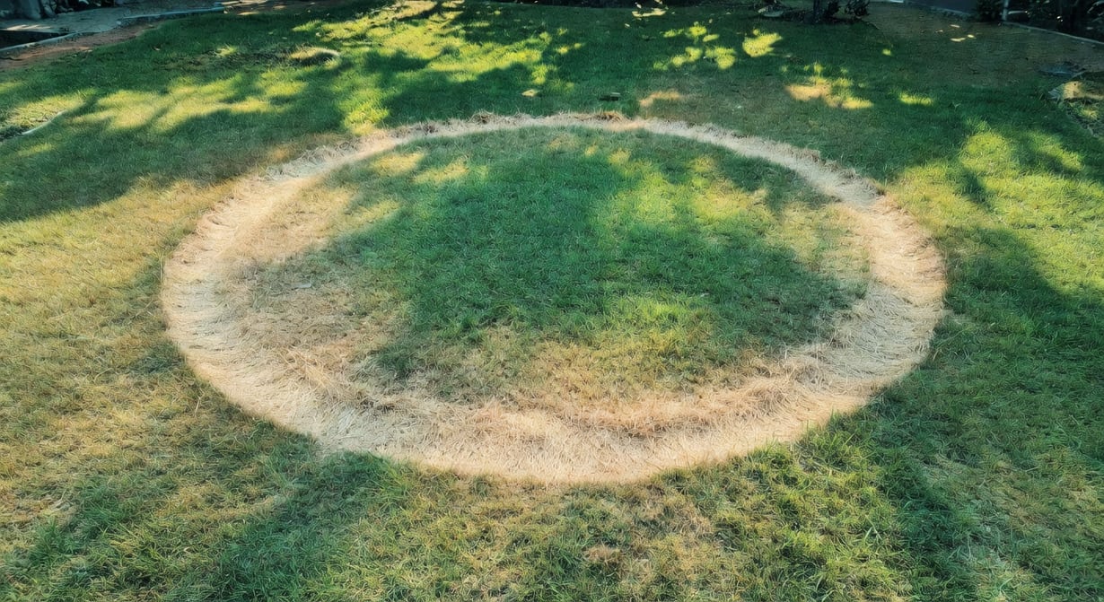 圓形或橢圓形、邊界清晰的枯黃環,最常見的原因是仙子環(fairy ring)或壞死環斑病(necrotic ring spot)。仙子環是由土壤中腐爛的有機質(樹根殘留、木頭碎片)分解產生的真菌絲所造成,真菌絲形成圈狀,消耗圈內的氮素並分泌疏水性物質使土壤拒水,導致草坪缺水、缺氮枯黃。典型的仙子環有時會在邊緣出現深綠色的超生長帶(因為真菌分解有機質釋放出氮素刺激了邊緣的草)和圈上長蘑菇,這兩個特徵幾乎是確診標誌。