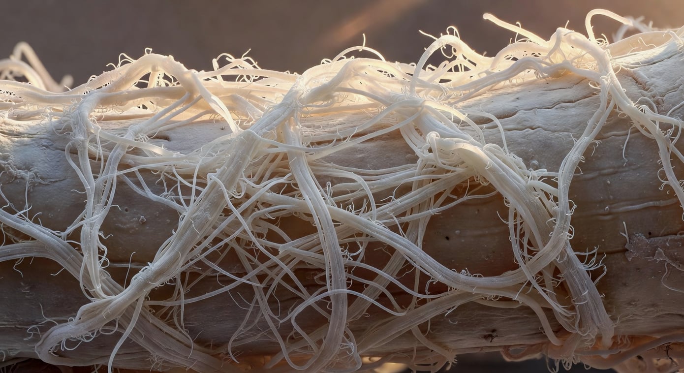 第三條路徑是根外菌絲擴張(mycorrhizal network extension)。菌根菌(mycorrhizal fungi),特別是叢枝菌根菌(Arbuscular Mycorrhizal Fungi,AMF),能將菌絲延伸至根系無法觸及的土壤空間,有效擴大植物的吸水吸礦面積高達 100 到 1000 倍。AMF 對磷、鋅、銅等移動性差的礦質元素特別有效,同時提升植物對乾旱和鹽分逆境的抗性。AMF 與植物宿主之間的碳代謝互換,讓它們真正成為根系的「延伸器官」而非寄生者。