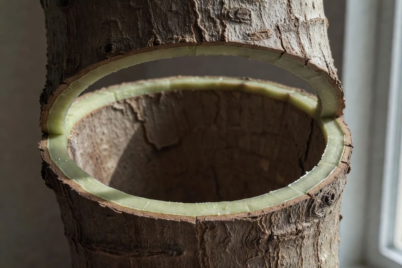 切口規格:在選定枝條上切出間距 0.5 到 1.5 公分的兩道環形平行切口(根據枝條粗細調整),切口深度恰好穿透樹皮和韌皮部,但不深入木質部。判斷深度的方法是:切穿樹皮後,若見到淺綠色至白色的形成層(cambium)組織,即為正確深度;若見到木材質地的棕色硬質組織,代表切得過深。移除兩道切口之間的一圈樹皮。