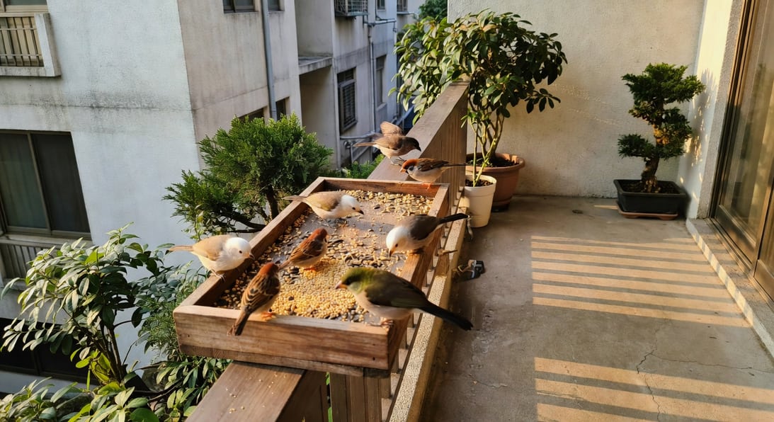 陽台族最常用的做法是買一個帶掛鉤的木製餵食台,掛在欄杆外側。選購時注意底部要有排水孔,或者在板面鑽幾個小洞,否則雨後積水很快就會讓飼料發霉,對鳥類健康有害。根據美國鳥類保育協會建議,最好每兩週清洗一次餵食台,用稀釋漂白水(大約一比九的比例)清潔後沖淨晾乾,避免細菌和黴菌在鳥群中擴散。