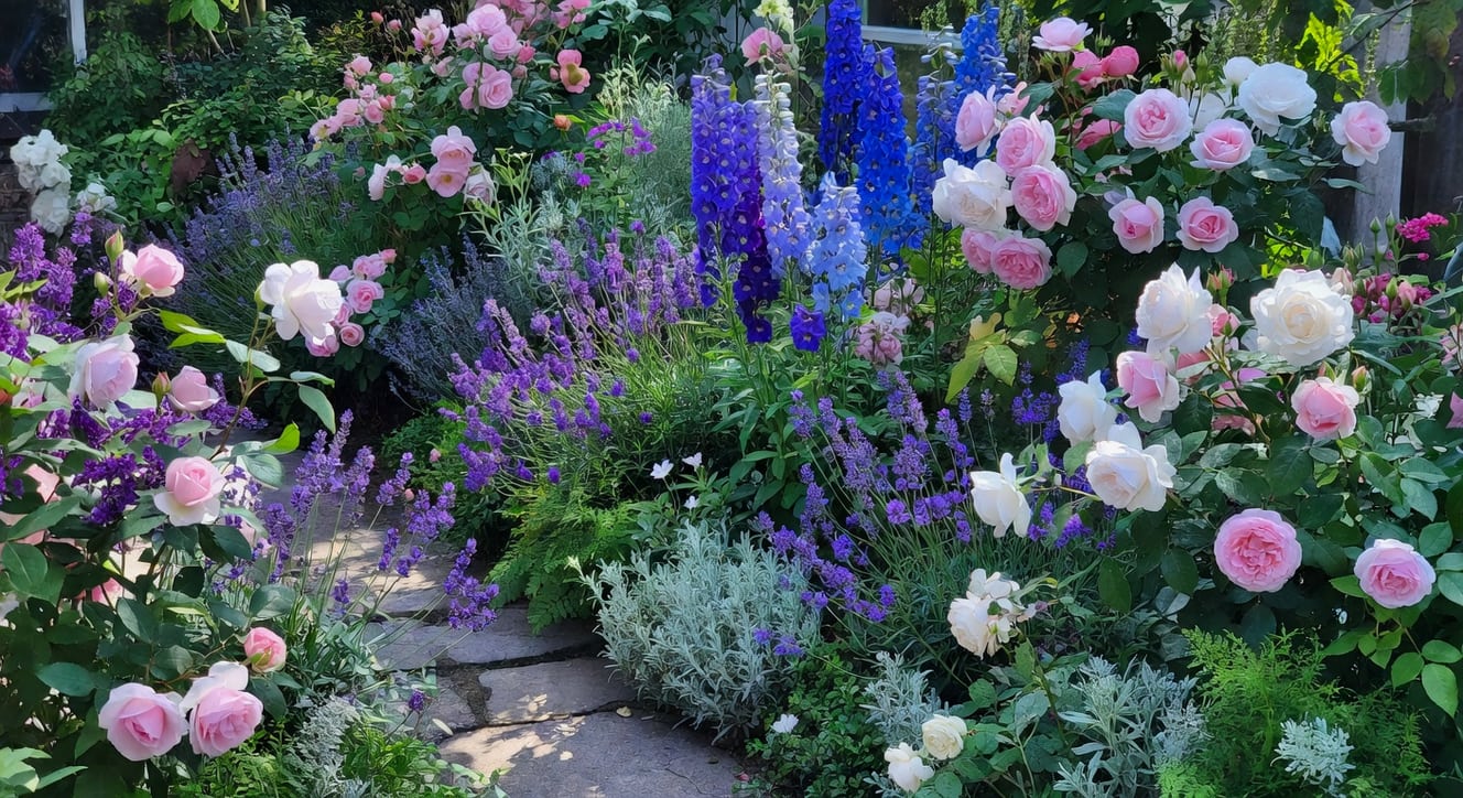 英式花園最迷人的那一刻,不是在書上看見它的時候,而是當你真正站在那裡,意識到自己被一種從各個高度湧來的美所包圍——上方有玫瑰攀著舊磚牆傾斜而下,中間有翠雀花的藍色尖塔與牡丹的圓潤形體互相應答,腳邊是匍匐的香草與丁香鼠尾草低吟的紫,整個花境像一個自有韻律的合唱,沒有哪一個聲部喧賓奪主,卻每一個都清晰可辨。