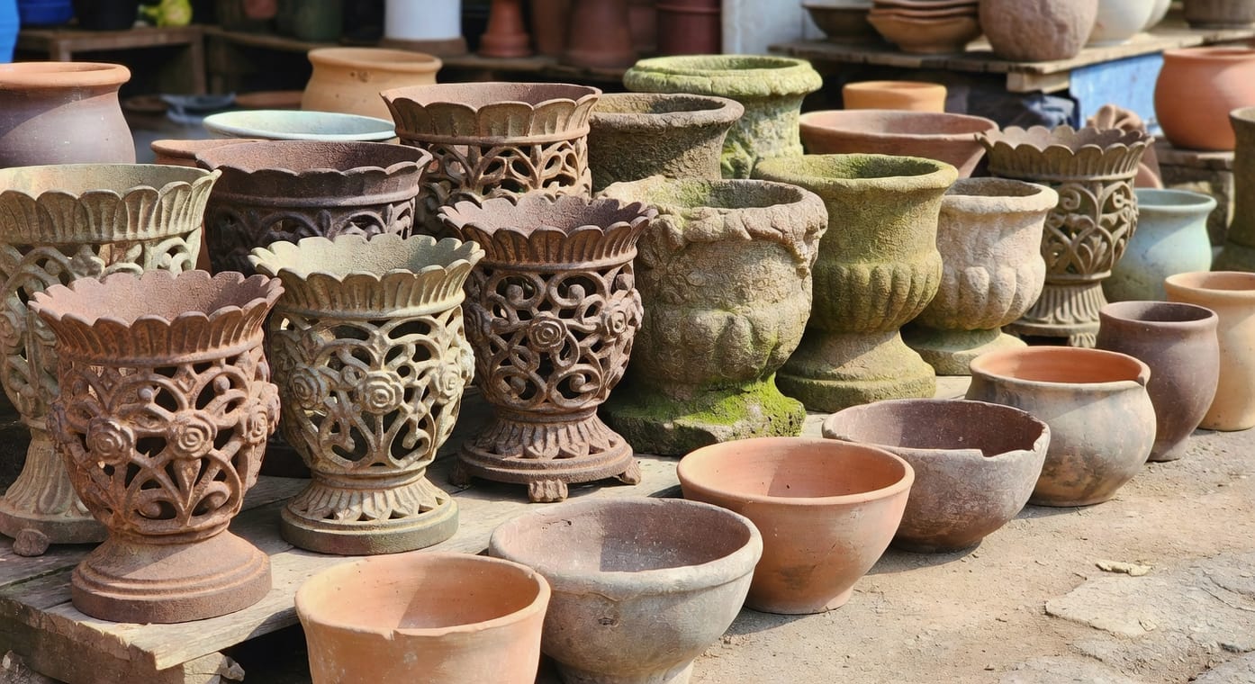 鑄鐵花器是另一個分類。維多利亞時代的英式鑄鐵花器,表面有繁複的浮雕紋樣,造型常為各種花葉組合;法式鑄鐵則相對簡潔,線條優雅。這類花器在種入植物後,植物的有機形態與器皿的精確紋樣之間形成一種生動的張力,彼此映照,各自更美。