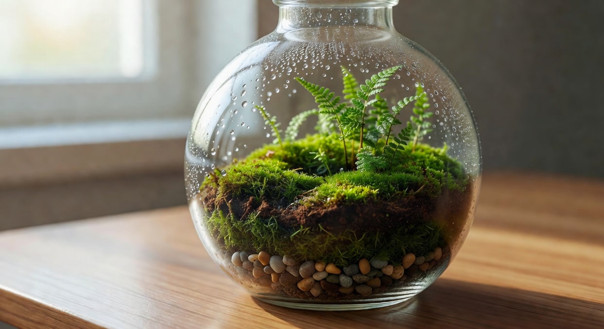 生態缸最令人著迷的,是它近乎自給自足的生命秩序。當你把一株苔蘚、一片蕨葉封進玻璃瓶,那一小方天地便開始自行呼吸——植物蒸散出水氣、水氣凝結於瓶壁、水珠再順著玻璃滑下浸潤土壤,如此週而復始,宛如一首無聲的小夜曲。