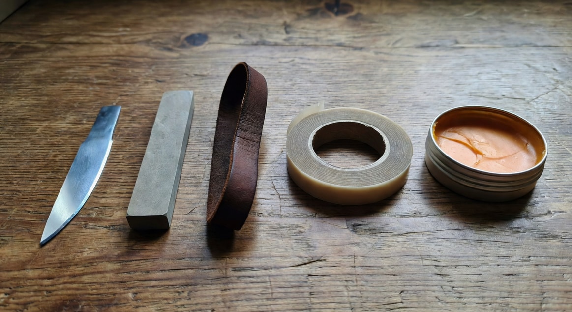 一把真正可用的嫁接刀,切面應呈現玻璃般的光滑反光,用放大鏡看不到鋸齒或撕裂纖維。新刀開箱後通常仍需以細油石(約 6000 目)進一步精磨,再以皮條(strop)整平刃口。磨刀時單面受力,另一面僅輕拖以去除毛邊(burr)——這是「單面開刃」的由來。
