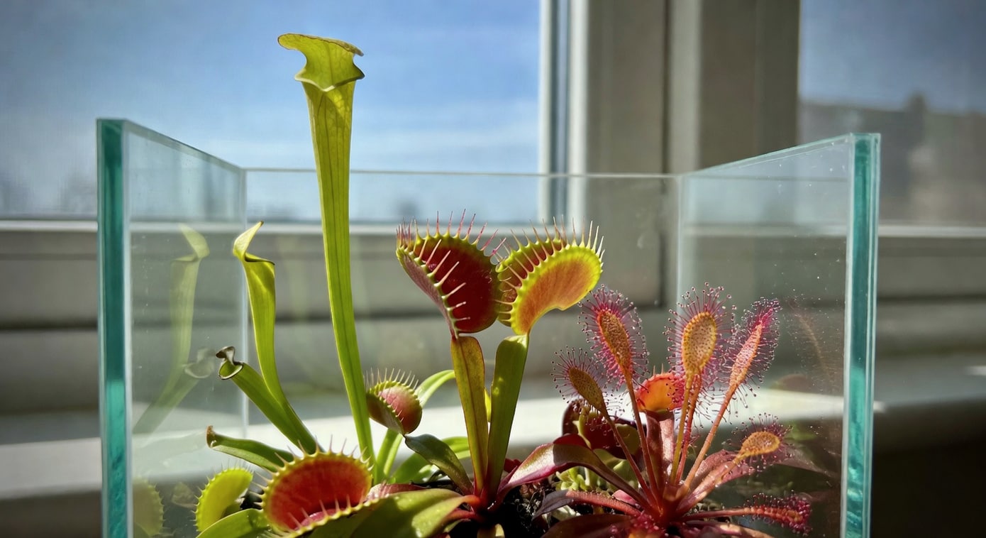 你小時候有沒有看過漫畫裡那種張著大嘴、會吞掉蚊子的怪植物?我小學三年級第一次在花市看到真正的捕蠅草,興奮到拿零用錢買回家,結果三天之後葉子全黑、整株陣亡。當時的我不懂為什麼,只覺得「這植物怎麼這麼難搞」。後來認真研究才知道,養死它的不是我太粗心,而是我太認真——澆自來水、施肥、放在書房角落、還餵牛肉屑,每一項都剛好踩在食蟲植物的雷點上。