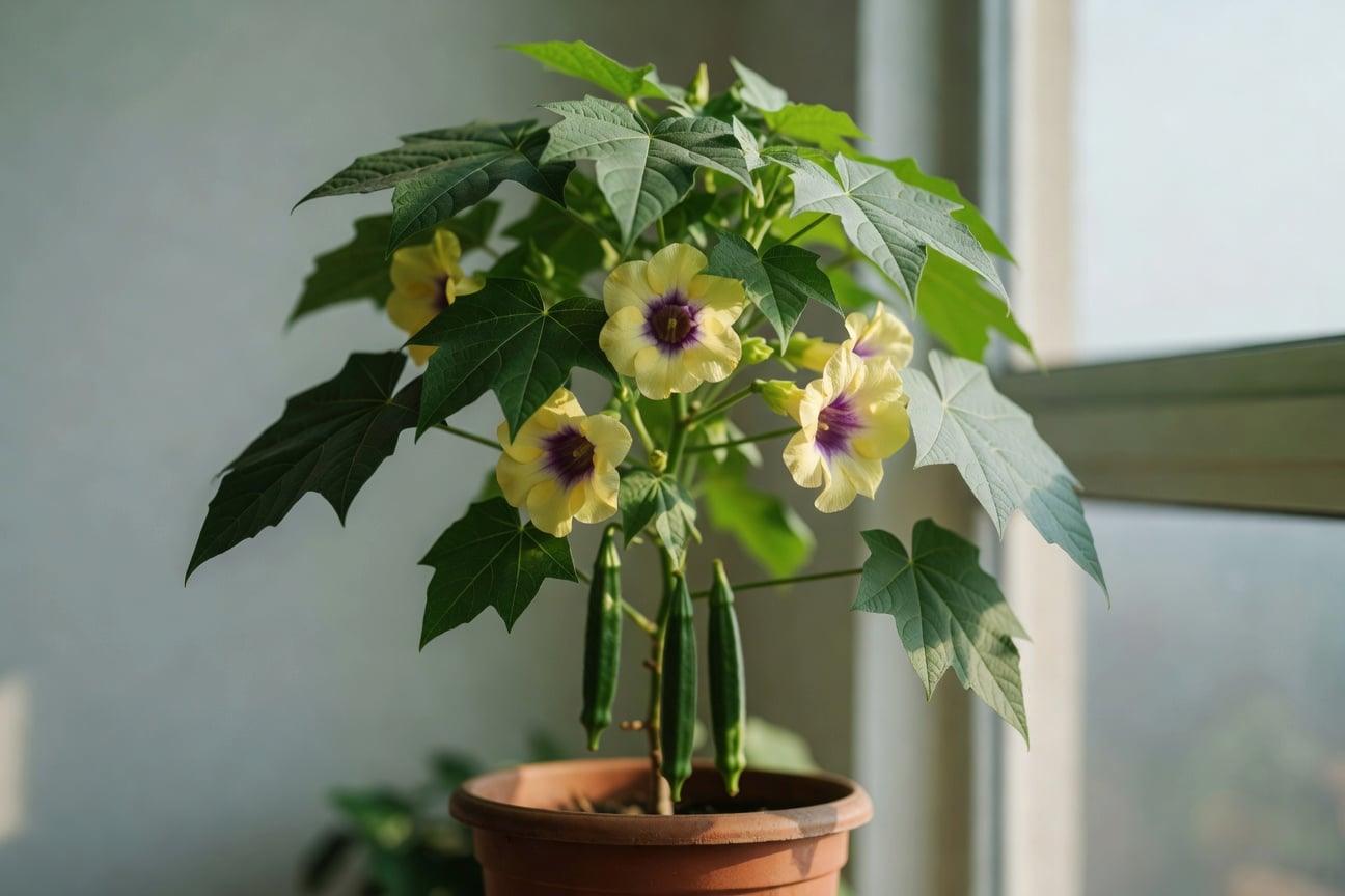 不開花幾乎八成是日照不足或氮肥過多。秋葵一天需要至少 6 小時直射陽光,少於這個就會徒長葉片。如果陽台偏北、光線不夠,老實說很難把秋葵種好,不如改種九層塔或紫蘇。