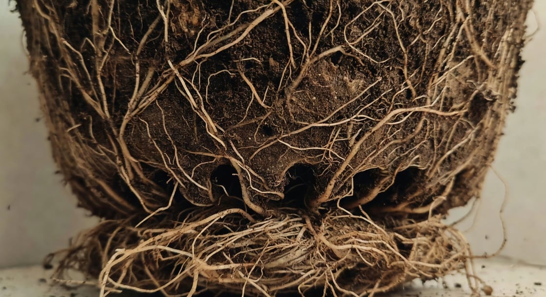 第二,根滿容器(pot-bound / root-bound)。植物在盆中長久不換盆,根系繞盆底盤旋一圈又一圈,最終堵塞排水孔,水分無處下滲,根系浸在積水中爛根。把盆脫下來看,若根球表面密密麻麻如白色漁網、盆底排水孔有根鑽出,就是典型症狀。