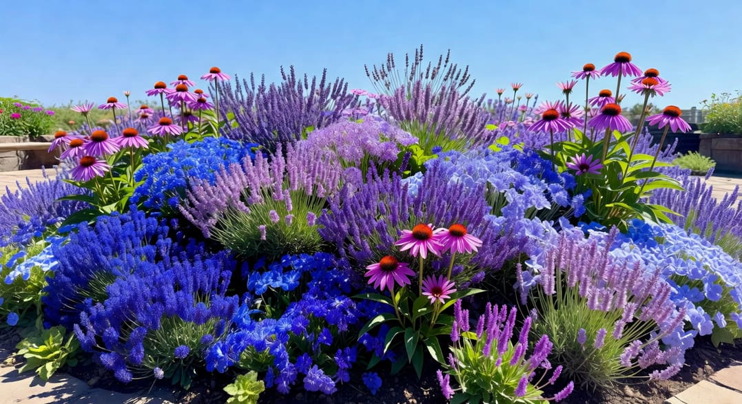 紫錐花(Echinacea purpurea)、飛燕草(delphinium)、鳶尾(iris)、葡萄風信子(Muscari)、藍雪花(plumbago),這些名字念起來就像詩句。各位不妨想像一個畫面:葡萄風信子低矮地鋪在前景像藍色的雲,鳶尾在中景挺立如書法的豎筆,飛燕草在後景拉長出天空的高度。