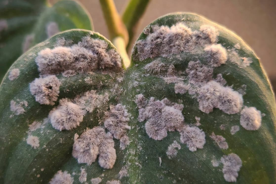學名 Botrytis,病徵是葉片或殘花上出現蓬鬆的灰色黴層,你靠近一碰它還會噴出一片孢子,超噁。它最愛從枯葉殘花開始下手,所以陽台那些你懶得摘的枯葉,就是它的免費入場券。