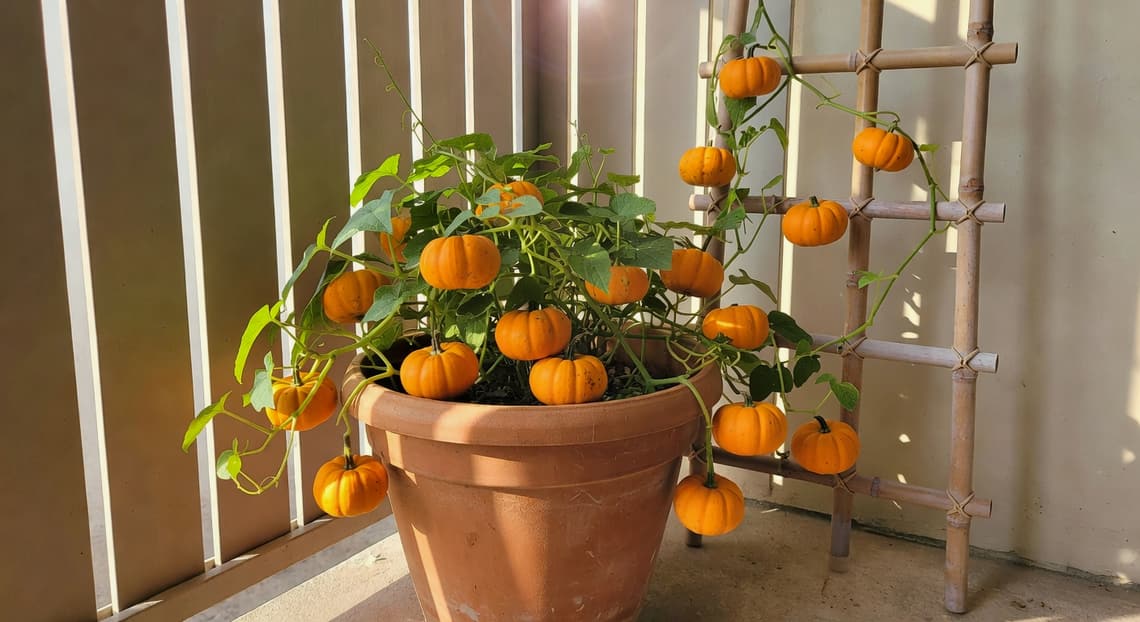 你有沒有過這種衝動?逛到菜市場看到那種金黃飽滿的南瓜,心裡冒出一個念頭:「我家陽台能不能也種一顆?」我第一次動這念頭時,上網一查就被潑了一桶冷水——一般南瓜(Cucurbita pepo 或 C. maxima)藤蔓動輒爬 4 公尺、株距還要留 1.5 公尺。這對陽台族根本是天方夜譚。不過別急著放棄,其實只要選對品種、搭對架子,陽台也能端出一鍋自家南瓜湯。