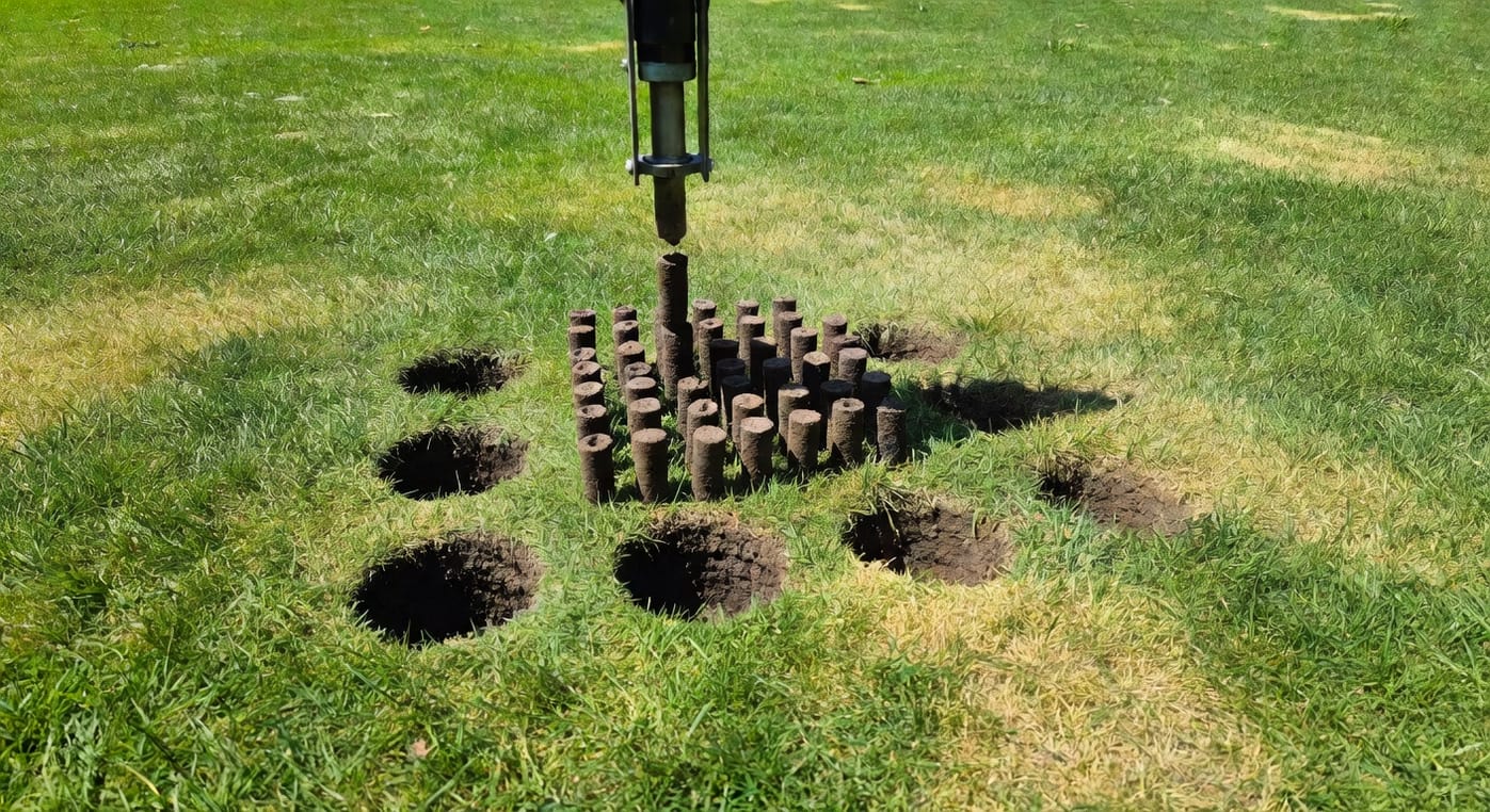 草坪一旦用過三年以上、又經常被家人小孩踩踏,你會慢慢發現幾個徵兆:草色整片泛黃、澆水後水不下滲而是形成小水坑、雨後泥土比以前更黏、整塊草皮聞起來有一股悶悶的酸味。這些都是土壤壓實(soil compaction)加上茅層(thatch,未腐的根莖殘渣)累積的結果。當土壤孔隙被壓扁、氧氣與水無法下達根區,草根會浮到土表呼吸、根系弱化、整塊草坪失去自我修復能力。解法就是打孔——讓土壤重新呼吸。