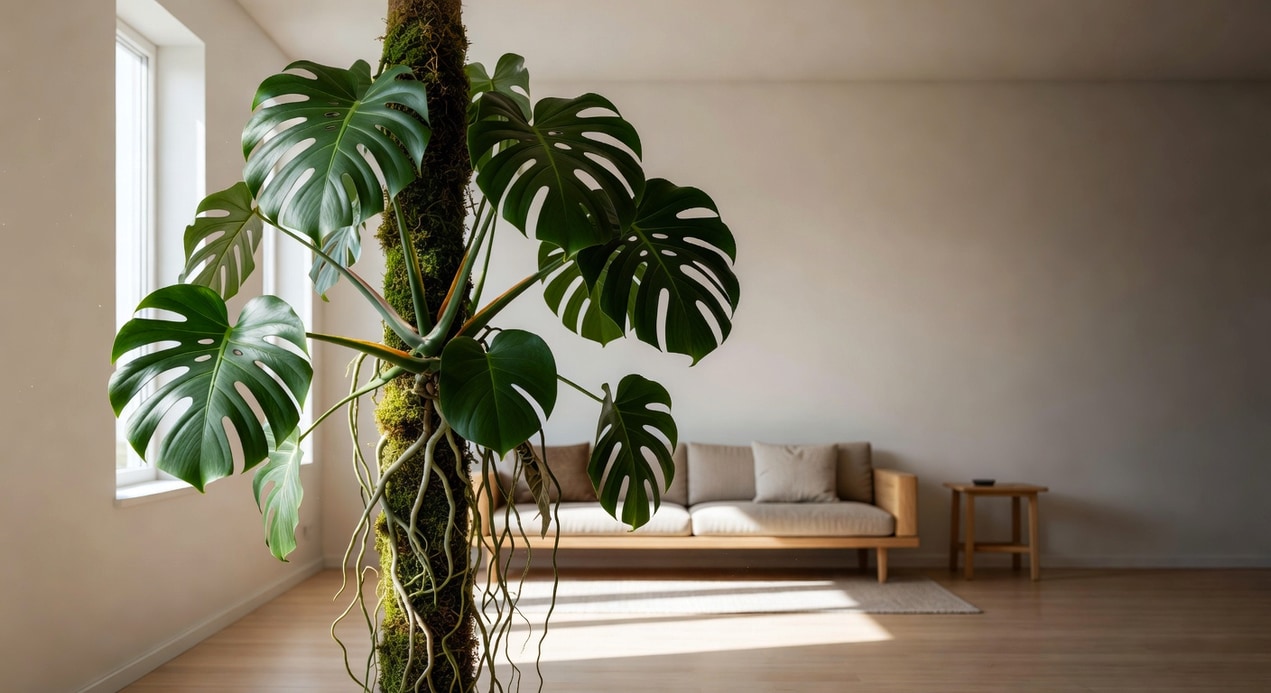 這是龜背芋最動人的一章。她原本就是攀緣而生,若無支撐,她永遠長不出最壯麗的自己。為她準備一根水苔柱(moss pole)或板式支架,讓氣生根攀附上去,並定期在水苔上噴水保濕,誘導氣生根深入附著。攀爬之後的龜背芋,新葉會明顯變大、裂片更深、穿孔更明顯——這不是玄學,而是攀爬姿態讓植株能輸送更多資源到新葉,使葉片展現「成熟版」形態。