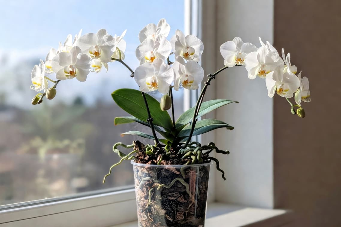 換盆大概每 2 到 3 年一次,因為樹皮介質會慢慢分解變細,保水太多反而會爛根。換盆時機選花後休息期,把舊介質撥掉、爛根剪掉,換上新的粗粒介質就好。