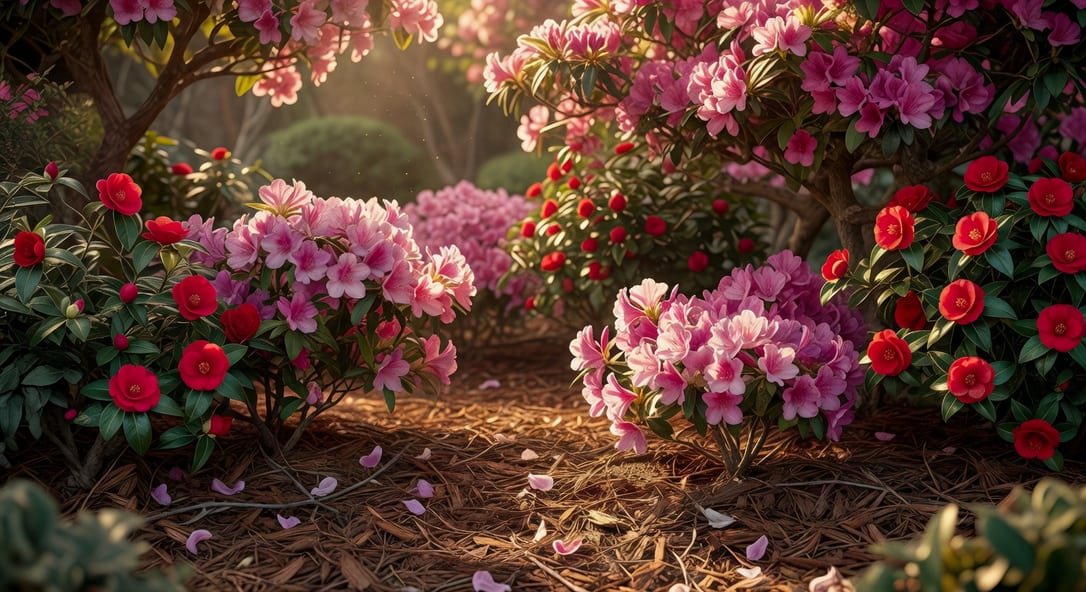 茶花與杜鵑共同的土壤需求是——pH 5.0 至 6.5、排水良好、富含有機質、根系淺而細。她們的毛細根密集分布於表土下 15 公分之內,對水分敏感,亦對土溫波動敏感,因此「覆蓋保濕」是不可或缺的環節。