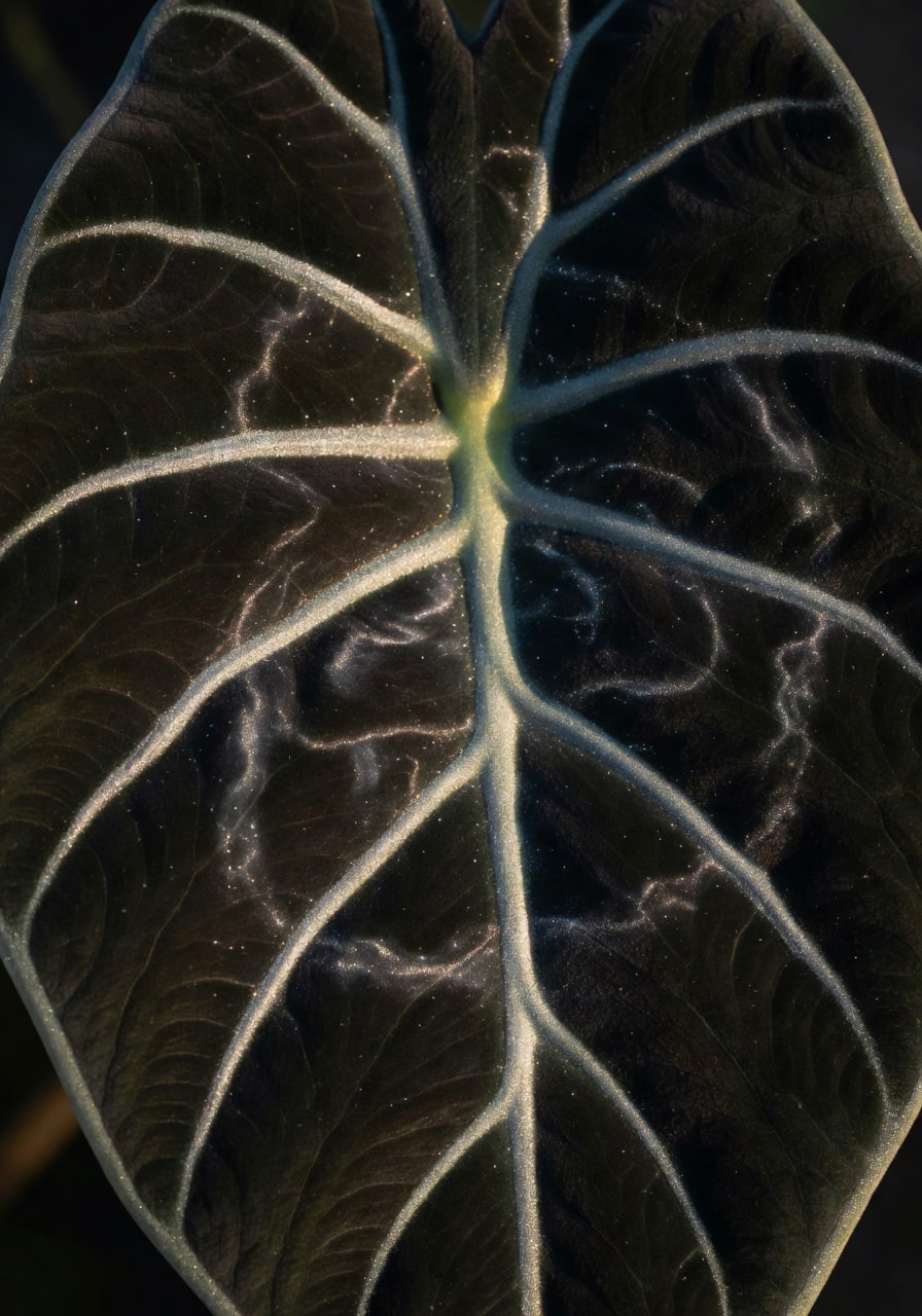 各位是否在某個午後的室內,看著一片 Alocasia 的葉子被斜光打亮——銀白的葉脈在近乎黑色的絨面上游動,像一張被細緻繪製的地圖?那一刻你會明白,天南星科的美不在於花,而在於葉脈與光線的私密對話。這篇文字,是獻給迷戀那道光的各位。
