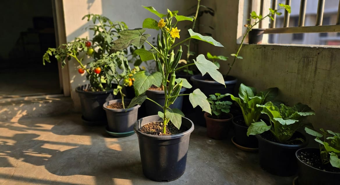 植株高度 90-120cm 很常見,品種如「五角」、「七角」、日系「Clemson spineless」差在莢的稜角數與口感。盆栽建議 30cm 寬深以上陶盆或塑膠盆,介質用無泥炭多用途介質(peat-free compost)搭珍珠石 2:1,排水好又保肥。栽培袋(grow bag)每袋 2 株也是好選擇。