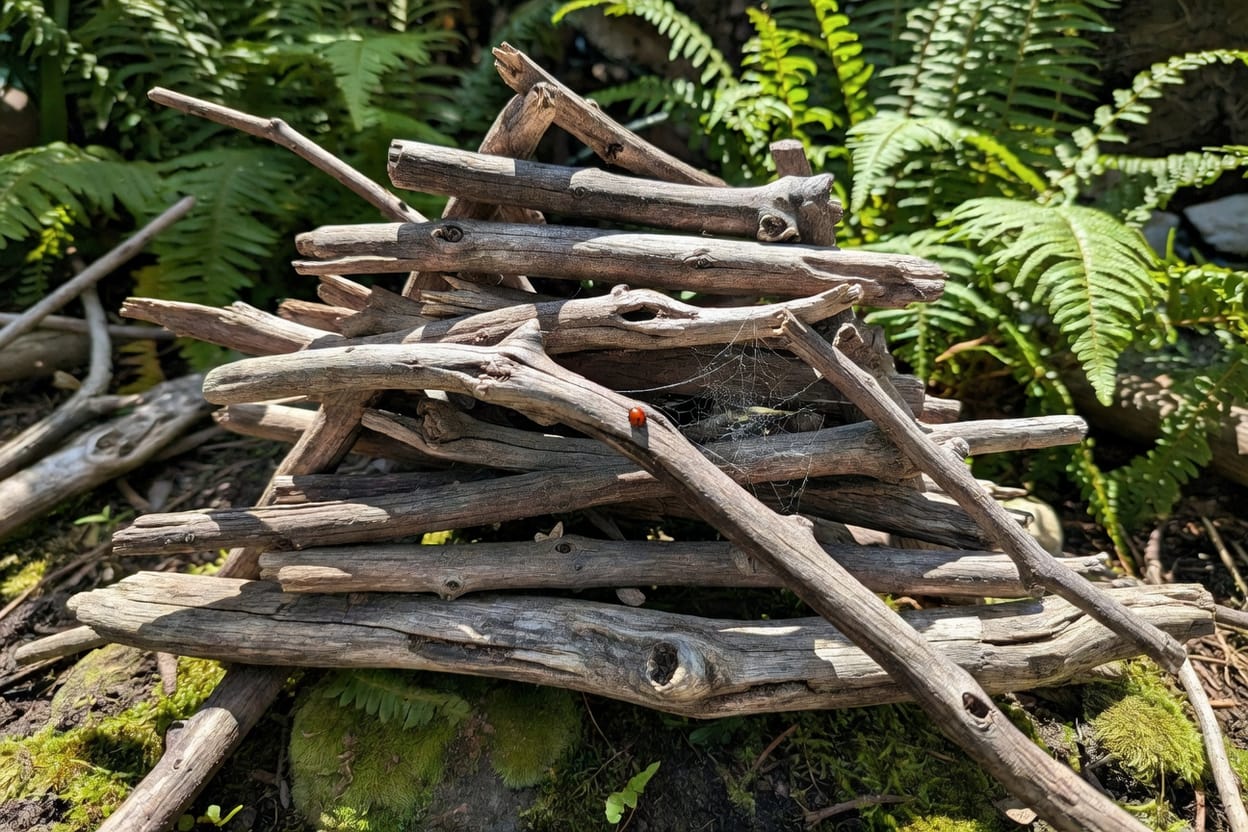 養護策略:不用養。各位什麼都不做是最好的養護——讓它自然風化、真菌定殖、昆蟲進駐。頂多每 2-3 年補一兩根新木進入同一堆,讓生命週期重疊不中斷。
