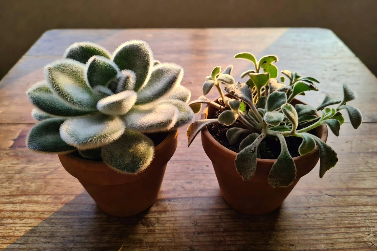 月兔耳的絨毛其實是極細小的**毛狀體(trichomes)**構造,它不像頭髮會再生——一旦被摩擦脫落,那片葉子的絨毛就不會長回來。很多人忍不住每天摸一下、搬一下、對它招招手,結果幾個月下來整株像被刷過一樣,只剩綠色葉面毫無質感。