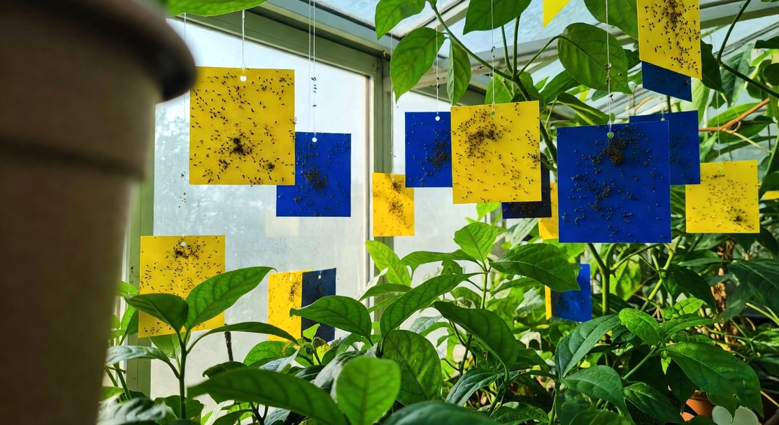溫室內新進的盆栽兩週後,葉背開始佈滿白色小蟲、葉面捲曲發黃、地面黏黏一層蜜露;菜園中的辣椒剛開花就發現花苞變形、葉脈被吸出銀白色斑紋——這是粉蝨(whitefly)與薊馬(thrips)等小型刺吸式害蟲的典型危害。黏蟲色板是物理防治中成本低、免用藥、同時兼具監測功能的工具,本文提供完整操作規範。