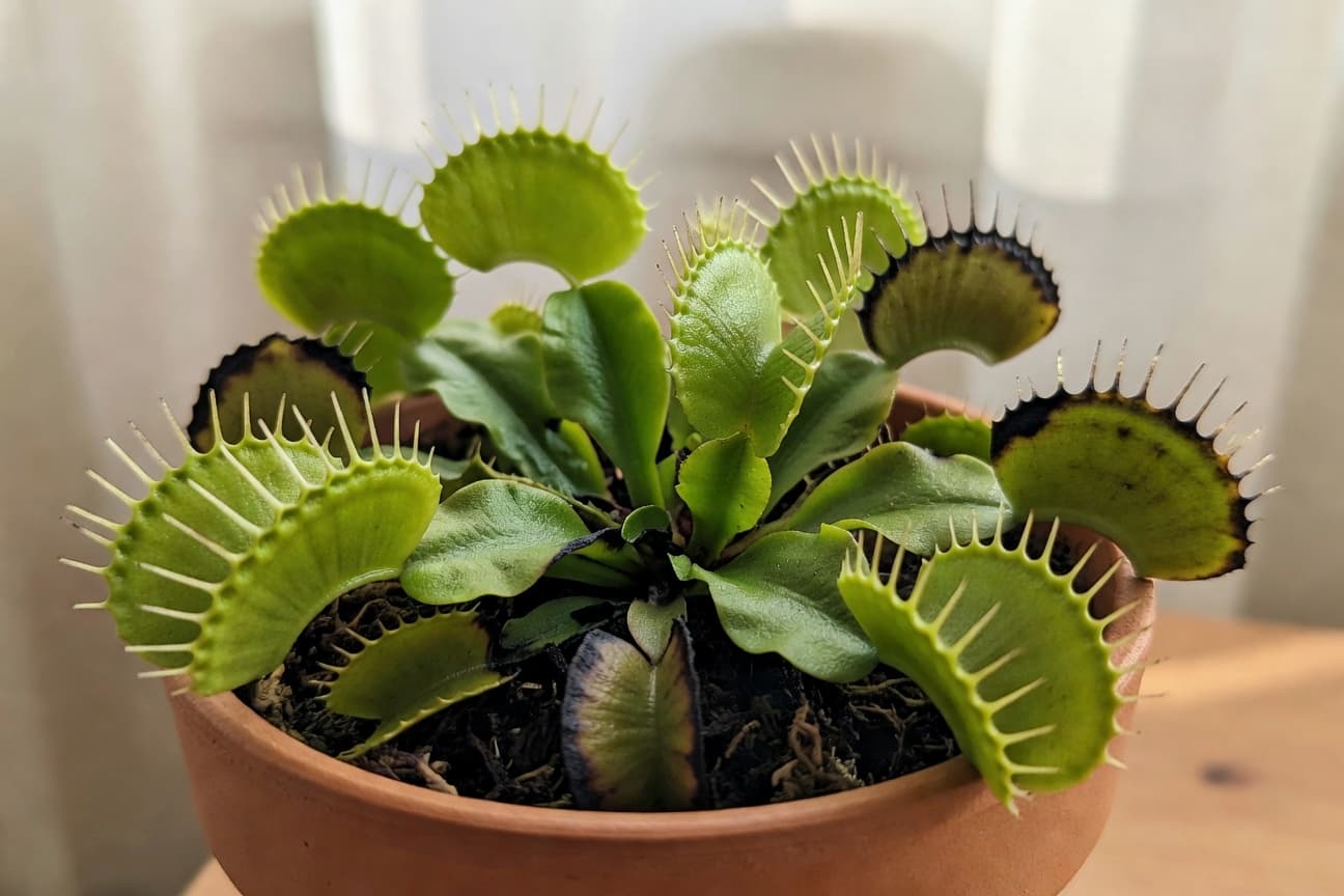 非常重要的一點:捕蠅草需要冬眠。**休眠一:**進入秋冬後植株生長速度大幅減慢,部分外圍葉片會自然轉黃變黑脫落,僅保留中央緊密的葉叢過冬。**休眠二:**這時夾子對刺激反應遲鈍甚至完全不動作,是正常生理現象,不需要餵食。**休眠三:**休眠期應減少澆水至土壤微潤即可,置於 5 至 10°C 涼爽處 2 至 3 個月,春天回暖後會自然抽出新一輪夾子。