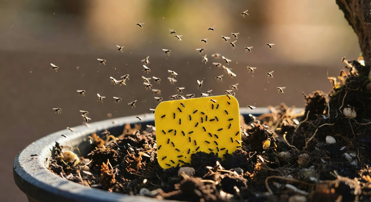 黏蟲板的配套做法。**配套一:**搭配每日輕拍盆栽,讓藏在土面的成蟲飛出後黏在板上。**配套二:**夜間點亮一盞小燈在黏蟲板旁,利用趨光性增加捕獲率。**配套三:**戶外或陽台植物可在窗邊也貼一片黏蟲板,攔截想入侵屋內的成蟲。