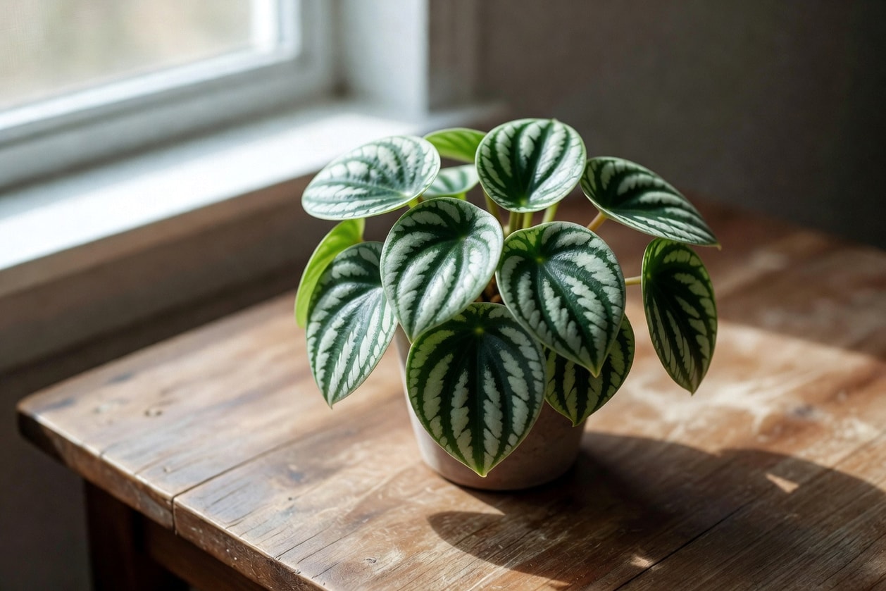 品種二:西瓜皮椒草(Watermelon Peperomia, Peperomia argyreia)——葉片呈卵圓形,銀綠色配深綠條紋活脫脫像西瓜外皮,葉柄紅褐色,視覺辨識度極高。
