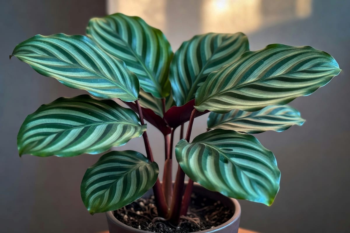需求一:濕度 ≥60%——這是首要條件。孔雀竹芋原生熱帶雨林,乾燥室內葉緣立即焦枯。