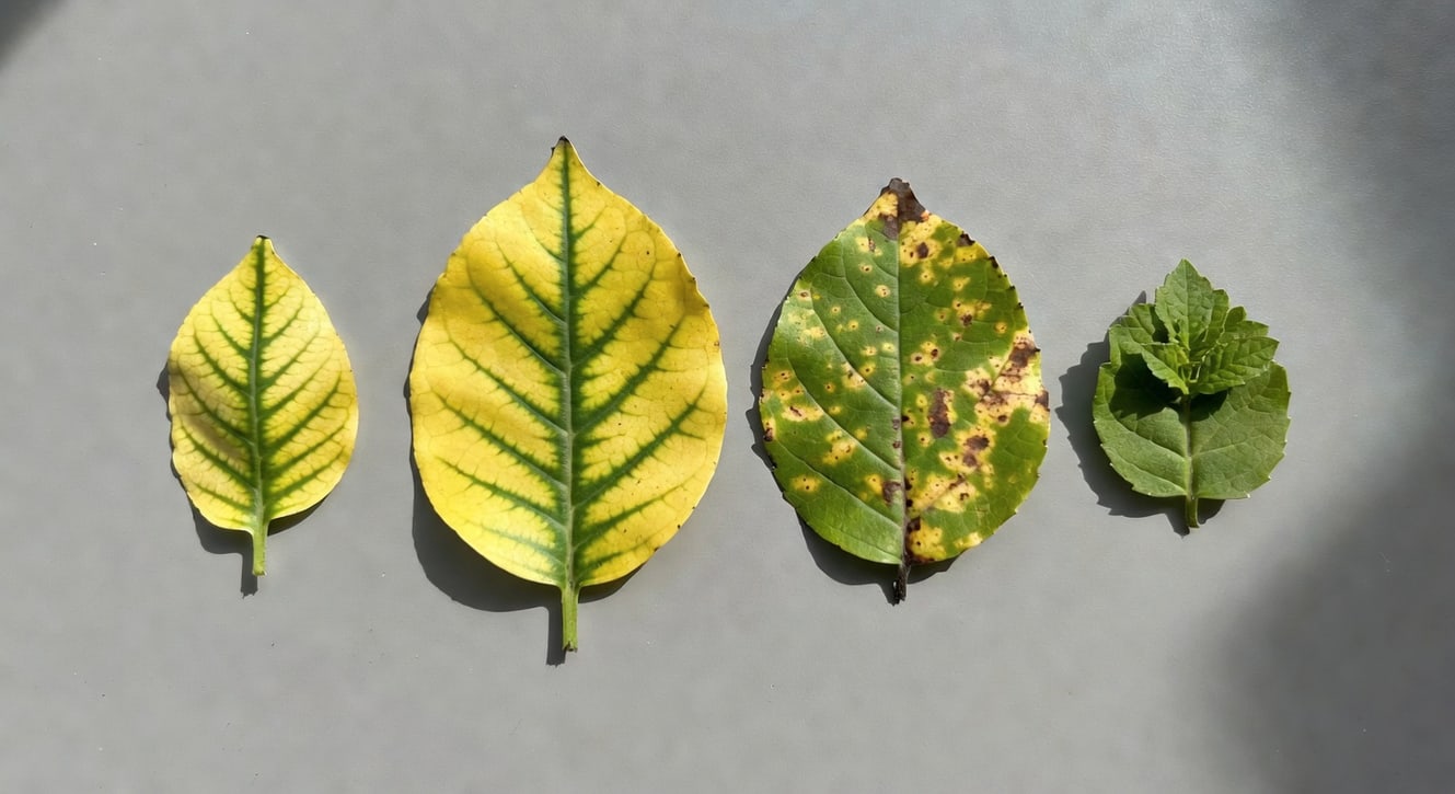 問題二:葉脈是否保留綠色? 葉脈綠、脈間黃 → 缺鐵(新葉)或缺鎂(老葉);整片均勻黃化 → 缺氮或日照不足。