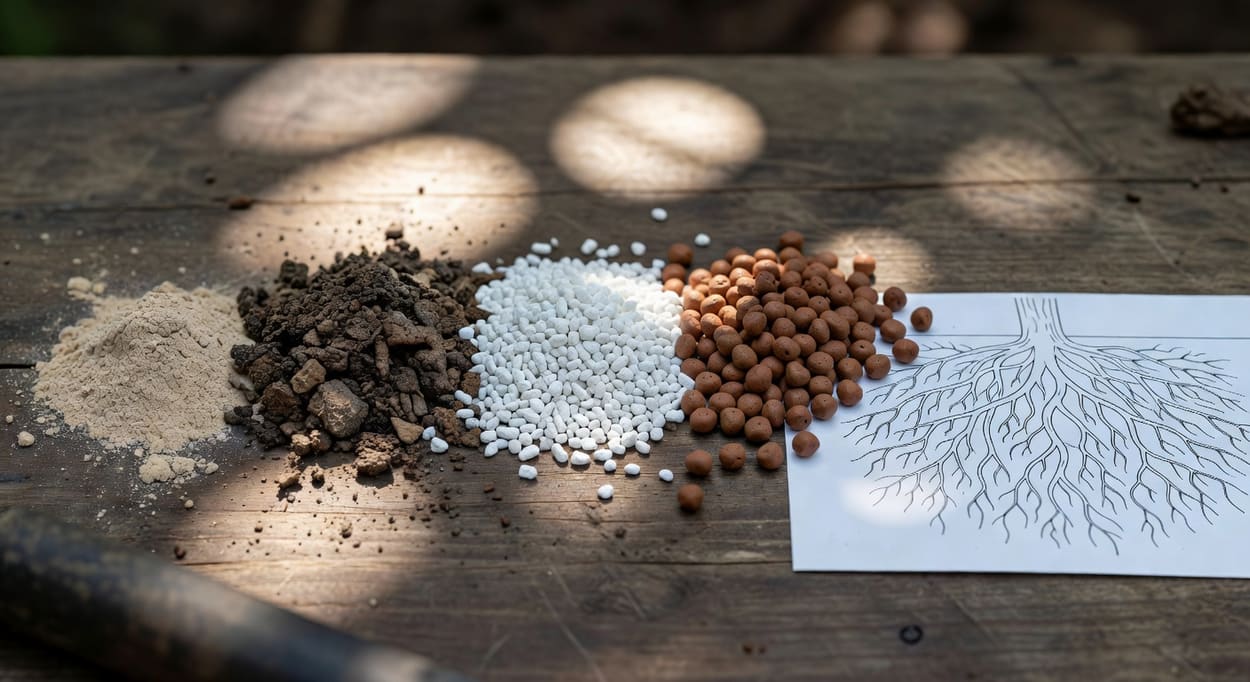 第一層:物理鬆土。 加入無機顆粒材料製造永久性孔隙。最常用的是珍珠岩(perlite)20-30%,便宜、輕、永不分解。其他選擇包括蛭石(vermiculite,吸水兼透氣)、粗砂(sharp sand,高密度但透氣)、椰塊(coco chunks,緩慢分解)、火山岩、赤玉土。混入比例依植物需求調整:多肉、仙人掌可達 50% 無機材料;觀葉植物 20-30%;蕨類 15-20%。
