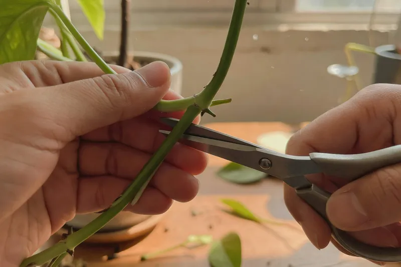 使用乾淨、尖銳的剪刀或修枝剪。這個步驟不能省略——用鈍的工具會把莖壓傷,大幅降低生根成功率。剪刀在使用前要消毒,可以用乙醇或漂白水清潔。剪口應該在生長節上方,因為根部通常從這裡萌發。