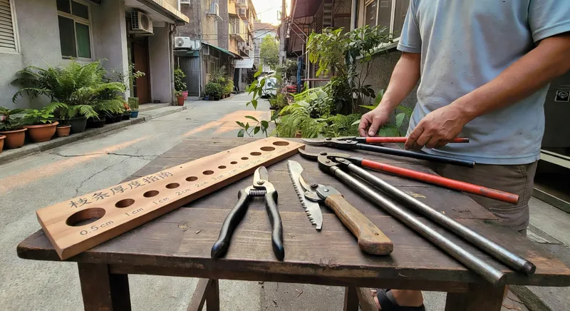 不同粗度的枝條需要對應的工具。直徑小於 1 公分的細枝,用單手剪刀 (bypass pruner) 即可,優勢是切口光滑、傷口小。1-3 公分的中型枝條用雙手剪刀 (lopper),更長的把手提供更大槓桿力。直徑超過 3 公分的主枝需用修剪鋸 (pruning saw),鋸齒與枝條的切割角度應在30-45度,這樣既能高效切割,又不易撕裂樹皮。