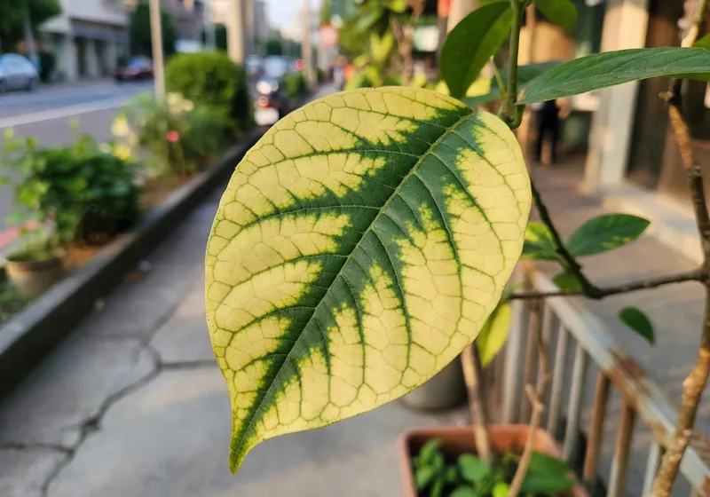 葉脈綠但葉肉褪色是缺鐵黃化,常見於鹼性土或硬水環境。用螯合鐵肥噴灑葉面見效快,或改善土壤酸度,用雨水澆水或加檸檬汁調整pH值。