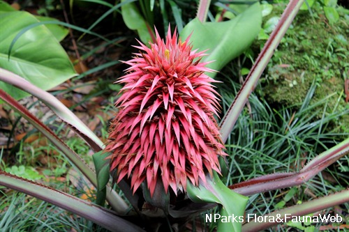 這是一種草本灌木,直徑超過 1.2 公尺,具有蓮座狀生長形式。葉片為綠色且寬廣,葉柄為紅色並帶刺。在高光照下,葉子會變紅。花序從植物中心冒出,由黃色花朵和粉橘色帶刺苞片組成。