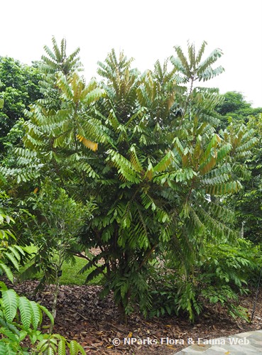 這是一棵樹,高達 30 公尺,具根柱高達 1 公尺。樹皮為棕灰色,受傷時會產生白色乳汁。葉為複葉(長 17–112 公分,寬 14–75 公分),每側有 4–6 枚近對生的葉片和 1 枚頂生小葉。葉片趨向於在枝條頂端密集聚集。小葉為橢圓形或長圓形(長 6.5–31 公分,寬 2–7 公分),上面光亮綠色,下面厚厚覆蓋白色和棕色盾狀鱗片,呈現銀色外觀。小葉基部圓形或不對稱,尖端漸尖(長 0.1 公分),每側有 9–20 條側脈。花序長達 60 公分,寬 60 公分,密布棕色盾狀鱗片。花朵小,橢圓形(長 2.5–3 毫米,寬 1.6–2 毫米),有 5 片花瓣和花藥,以及深裂成 5 裂的棕色花萼。果實為卵狀至倒卵狀(長 3–3.5 公分,寬 2–3 公分),成熟時變黃或棕色,但不開裂。每個果實有 2–3 室,每室含 1 粒種子。種子被白色甜酸假種皮包圍。