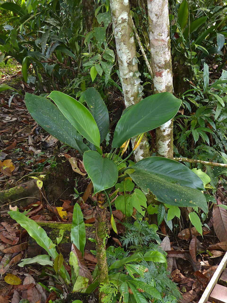 草本多年生植物,直立生長習性,高達0.6米。葉片大、互生,呈長圓形至披針形,葉緣全緣(光滑、無齒或裂片),葉尖漸尖(逐漸變細成尖端)。葉片多為閃亮的白色,帶綠色邊緣和不規則斑紋,這些斑紋趨向於與側脈平行。葉片背面為黃綠色。花朵由綠色佛焰苞和白色肉穗花組成。