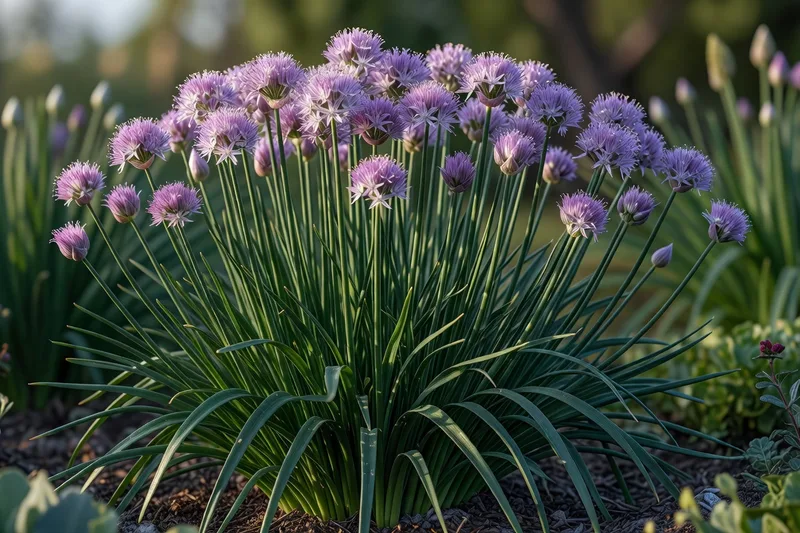 這是一種球莖多年生植物,高約30厘米,形成一叢細長、帶狀、洋蔥味的淺綠色葉子。圓形的淡紫色花朵在仲夏至晚夏出現。