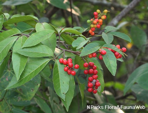 它通常是一種灌木或攀援植物,高達25米,但在新加坡,通常只有3米或更低。它的葉子螺旋排列,短柄,通常是三葉複葉。葉片為膜質、肉質或革質,通常為橢圓形或長橢圓形,長2.5-35厘米,寬1.5-22厘米,邊緣略有鋸齒。乾燥後的葉片表面暗淡有光澤,上面為綠色至灰色或深褐色,下面為淺綠色至紅褐色。它的花短柄,微香,直徑達2.5毫米,花瓣白色,花萼綠色至淺白色,花序在花枝軸上,分支或不分支,最長達40厘米。它的果實單籽,圓形,直徑4.5–13毫米,寬3.5–8毫米,光滑至微皺,成熟時呈暗橙紅色。