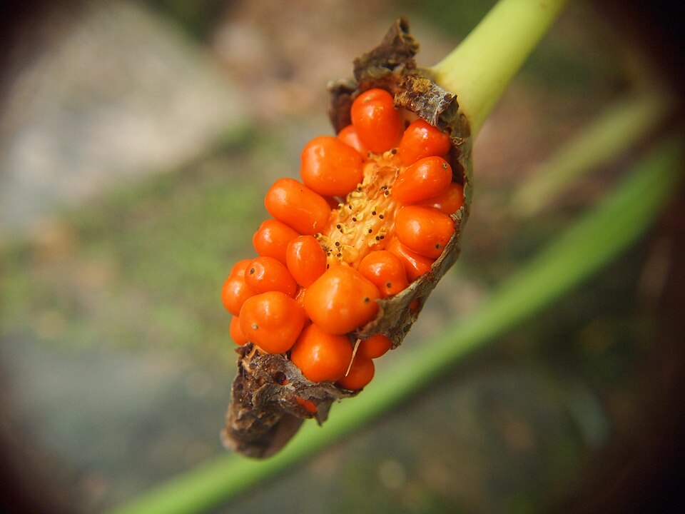 這是一種草本植物,高達150公分,下部莖部(球莖)可長達60公分。它的葉子互生,有葉柄,葉片呈箭頭狀,上表面深綠色,下表面淺綠色或紫色,大小25-85 x 7-40公分,可能有或無白色葉脈。它的葉柄為巧克力棕色,通常有斑紋。它的花朵生長在6-13公分長的花序中,被綠色至白色的修飾葉(佛焰苞)包圍,花苞長9-10公分。它的果實為圓形,橙色,長4-7毫米,含有一個大種子。