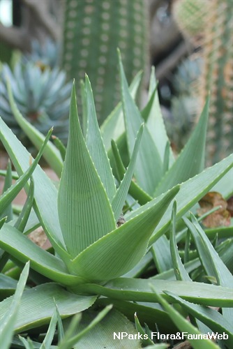 多肉植物,形成開放的蓮座狀,高達30厘米。蓮座由8-12片葉子組成(長18-40厘米,寬3-6厘米)。葉子上長有黃色棘刺(長4-6毫米,寬1.5-2.5毫米)。管狀花朵基部呈粉紅色,中部為奶油色,頂部為深綠色。它們排列成穗狀花序,稱為總狀花序(高40-80厘米),或分為1-2支。