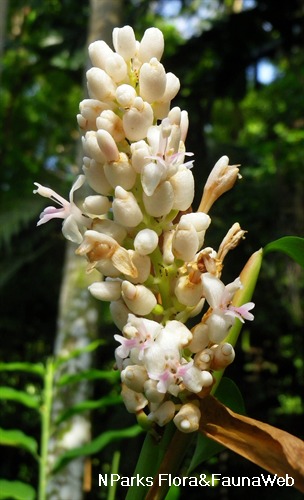 根莖草本植物,高達1.6米。葉叢高達1.2-1.5米,葉片長20-30厘米,中綠色。萼片白色,護狀,包圍花蕾在早期發育階段,並在盛開時覆蓋花冠管長度的一半。花冠裂片白色,花唇白色帶淡紫粉色斑紋。