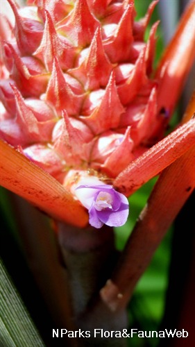 它是陸生鳳梨植物,高達1米。葉片為線形,長達1米寬4厘米,邊緣無刺或尖端有銳利刺。葉面光滑,淺橄欖綠色帶有暗紅棕色中線,下表面覆蓋藍灰色絨毛。花序為球狀穗狀花序,直徑達5厘米,每朵花有鮮粉紅色花苞。花由鮮粉紅色萼片和白色花瓣組成,花瓣上部三分之一(朝向尖端)帶紫色。果實為聚合果。