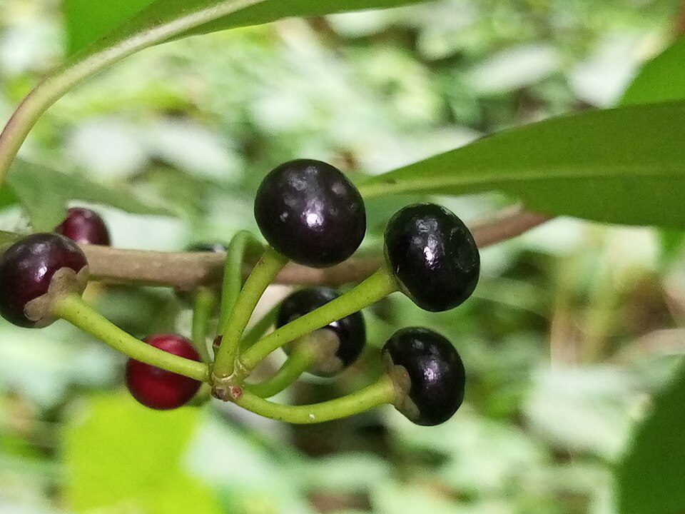 它是一種灌木或小樹。它的葉子是革質的、橢圓形、綠色,並在邊緣有不規則的白色斑紋。它的花朵成簇生長,具有粉紅色的蠟質花瓣。它的果實是圓形的肉質漿果,成熟時變成紫色。