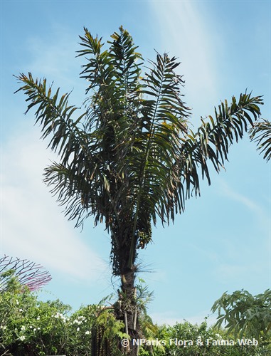 單株棕櫚樹,高達20米,冠部深黑色,葉片巨大且陡峭上升。花朵密集,並散發淡淡的霉味。